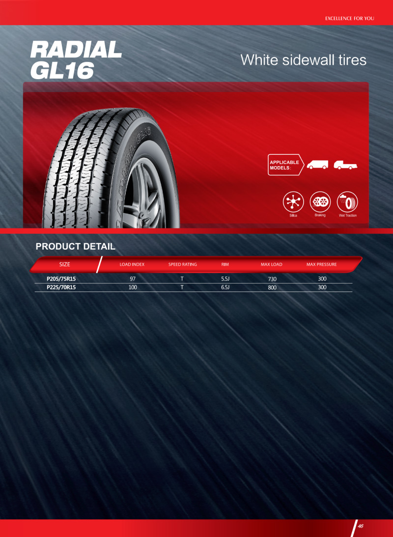 RADIAL GL16 胎側(cè)白環(huán)裝飾,汽車行駛更受矚目,獨特花紋設(shè)計,具有良好的排水性能和制動力