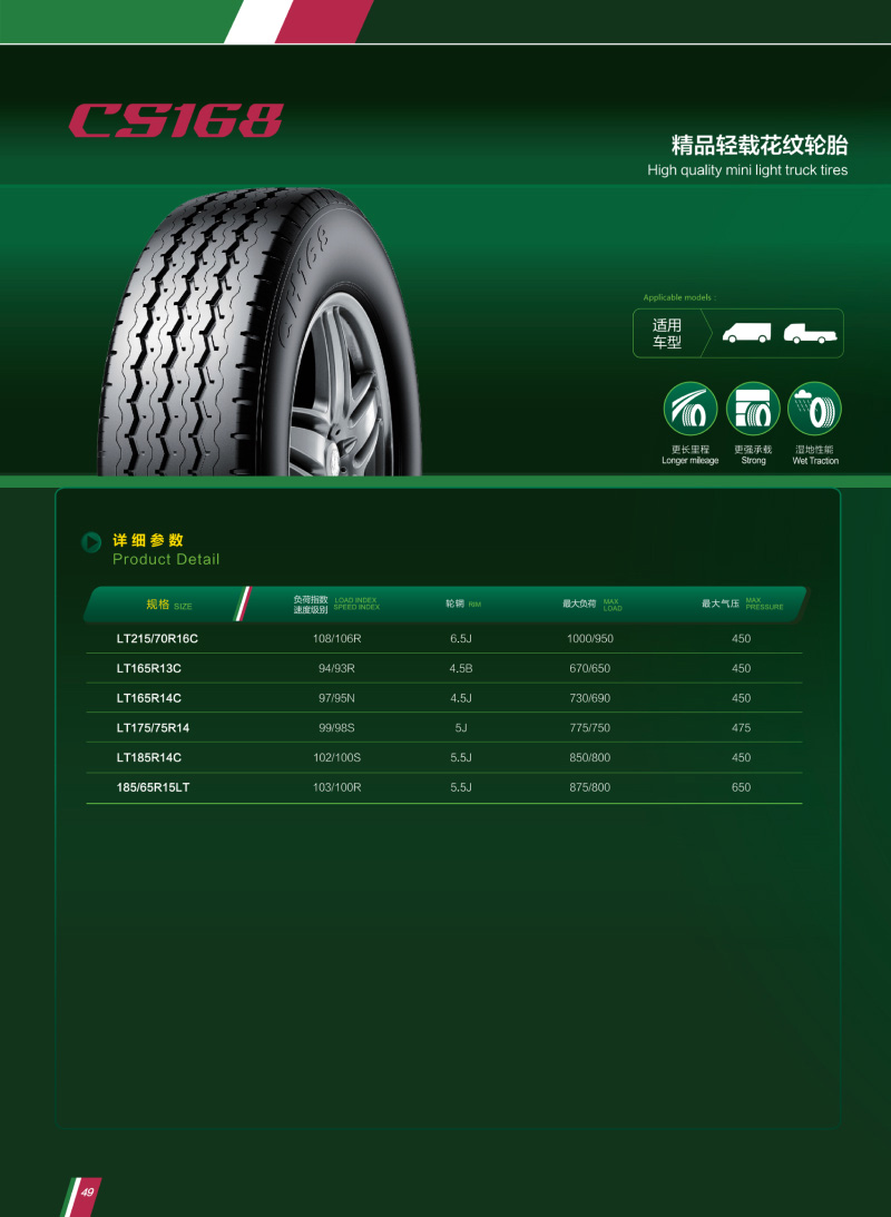 CS 168 精品輕載花紋曲折的花紋溝槽加雙層胎體結(jié)構(gòu),更強(qiáng)的承載力,深花紋設(shè)計(jì)提供卓越的耐久性能。