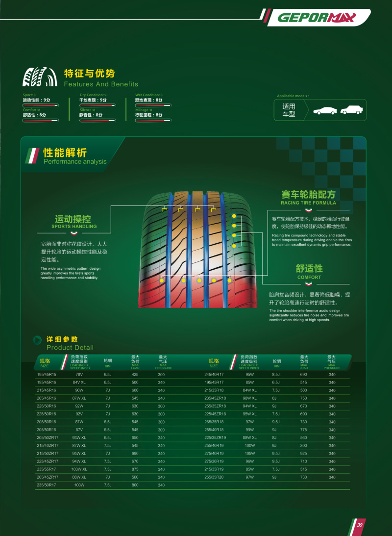 出眾的操控性能,運(yùn)動(dòng)型輪胎中不可多得的兼具舒適性,駕乘更流暢、更舒適。