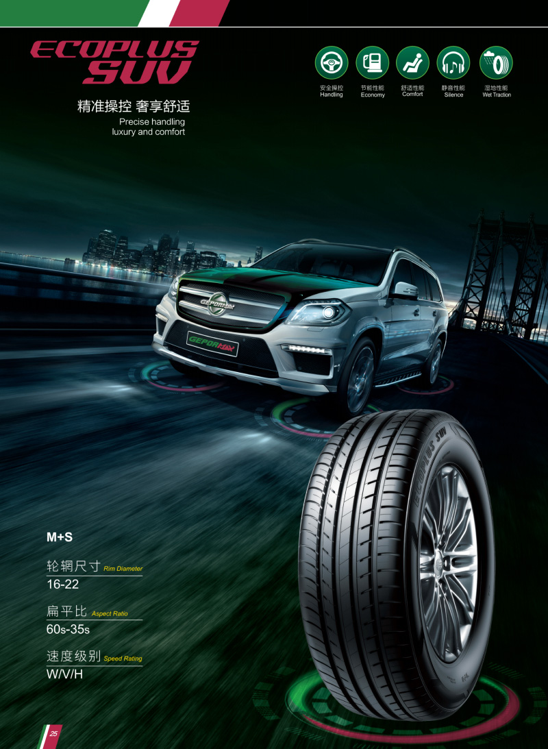 ECOPLUS SUV SUV專用輪胎,靜音胎面,超強(qiáng)抓地設(shè)計(jì),精準(zhǔn)操控。