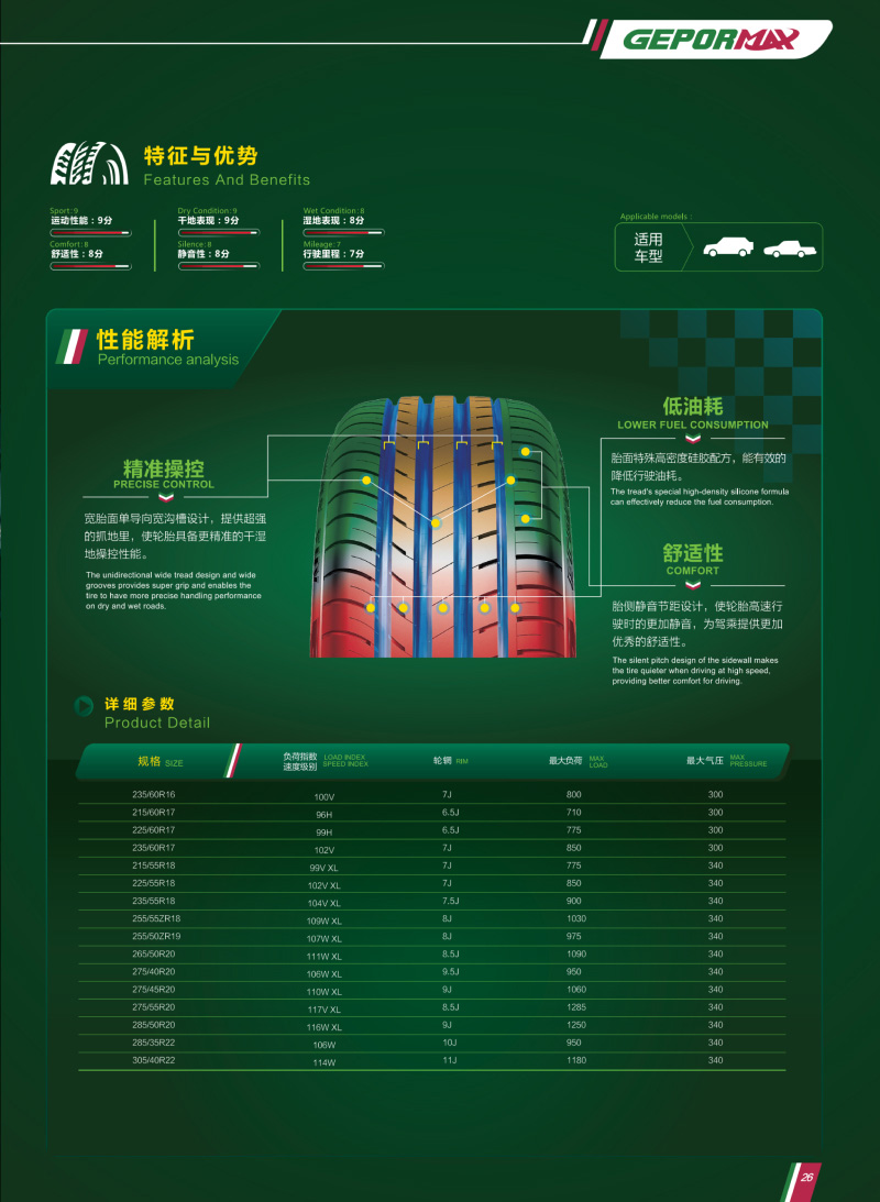 SUV專用輪胎,靜音胎面,超強(qiáng)抓地設(shè)計(jì),精準(zhǔn)操控。